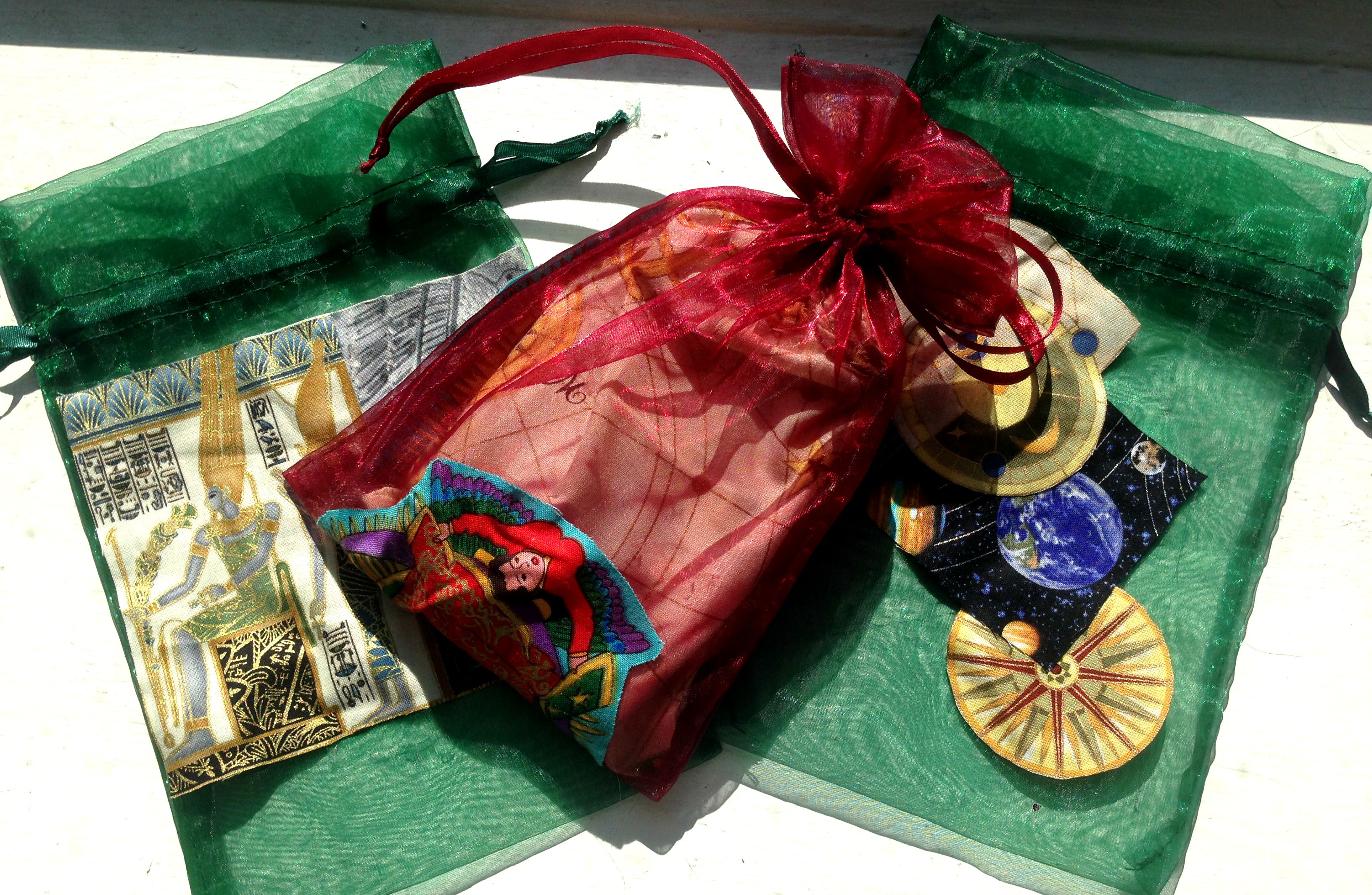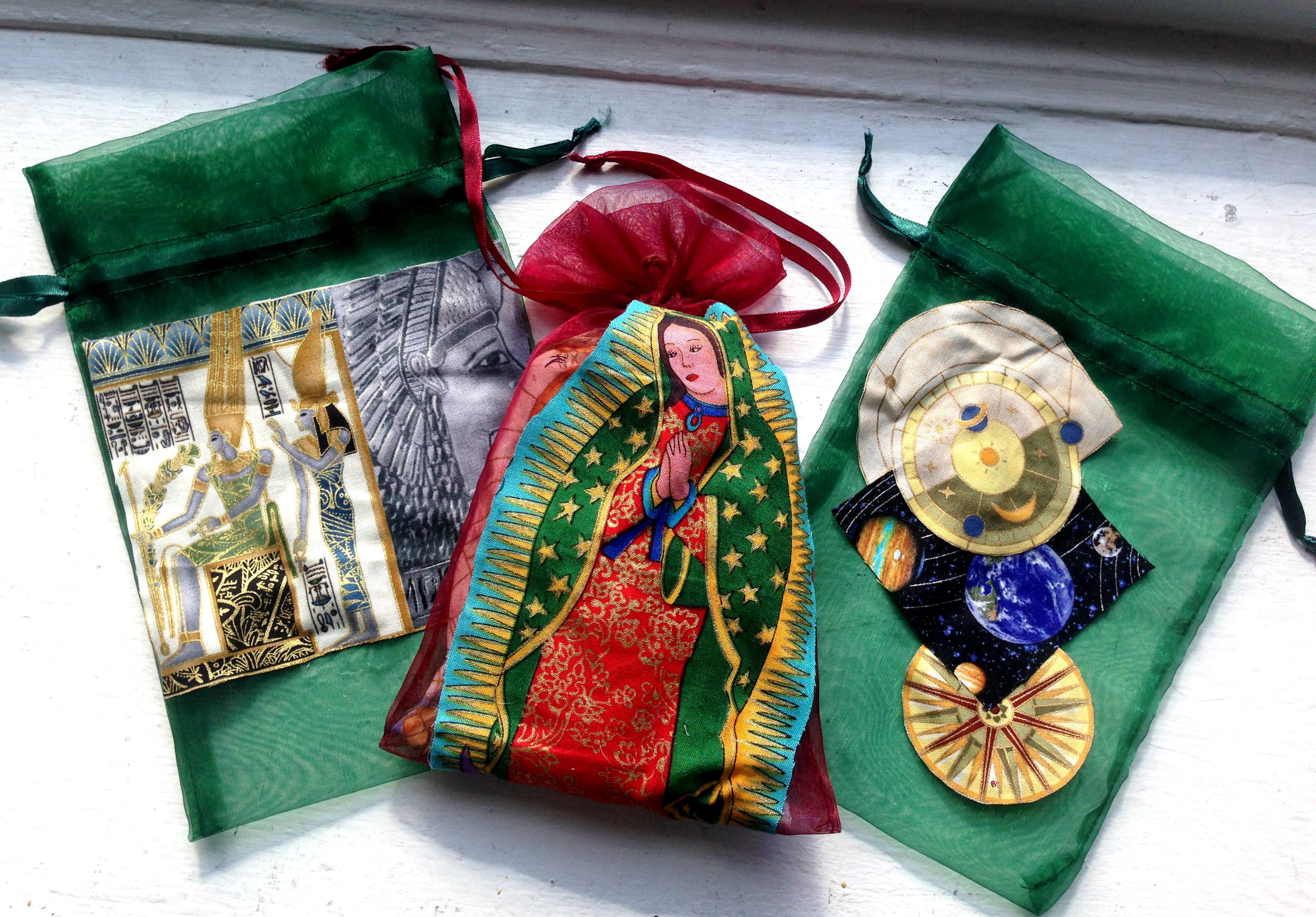 Clear sachets to hold the same tools of the trade! I picked the images from the fabrics and used those as a focus for decorating the sachets. The left has Egyptian imagery (very powerful), the centre (which is my favourite) has the holy mother Mary in all her glory, and the right has geomancy-themed goodness: planets, planet movements, geometric shapes and layering, a compass to direct the spirit.