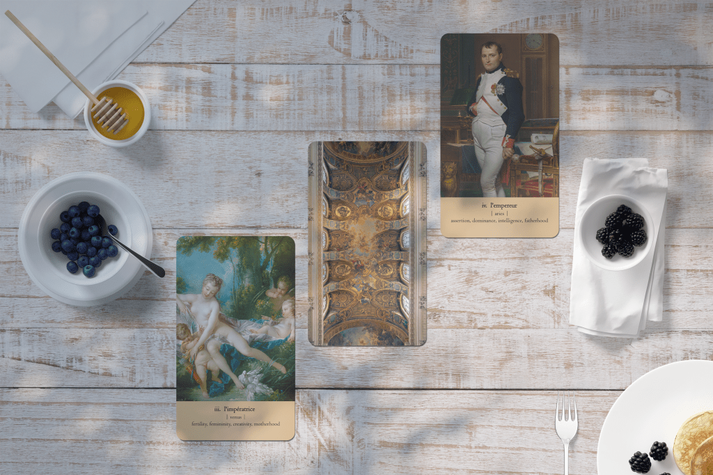 You are encouraged to dive deep into the painting and pull out the meaning for your readings, and to not be so reliant on the corresponding guidebook. It’s meant to move you and take you away to a different time, telling a story in your mind that you can then relay through your spreads and readings.