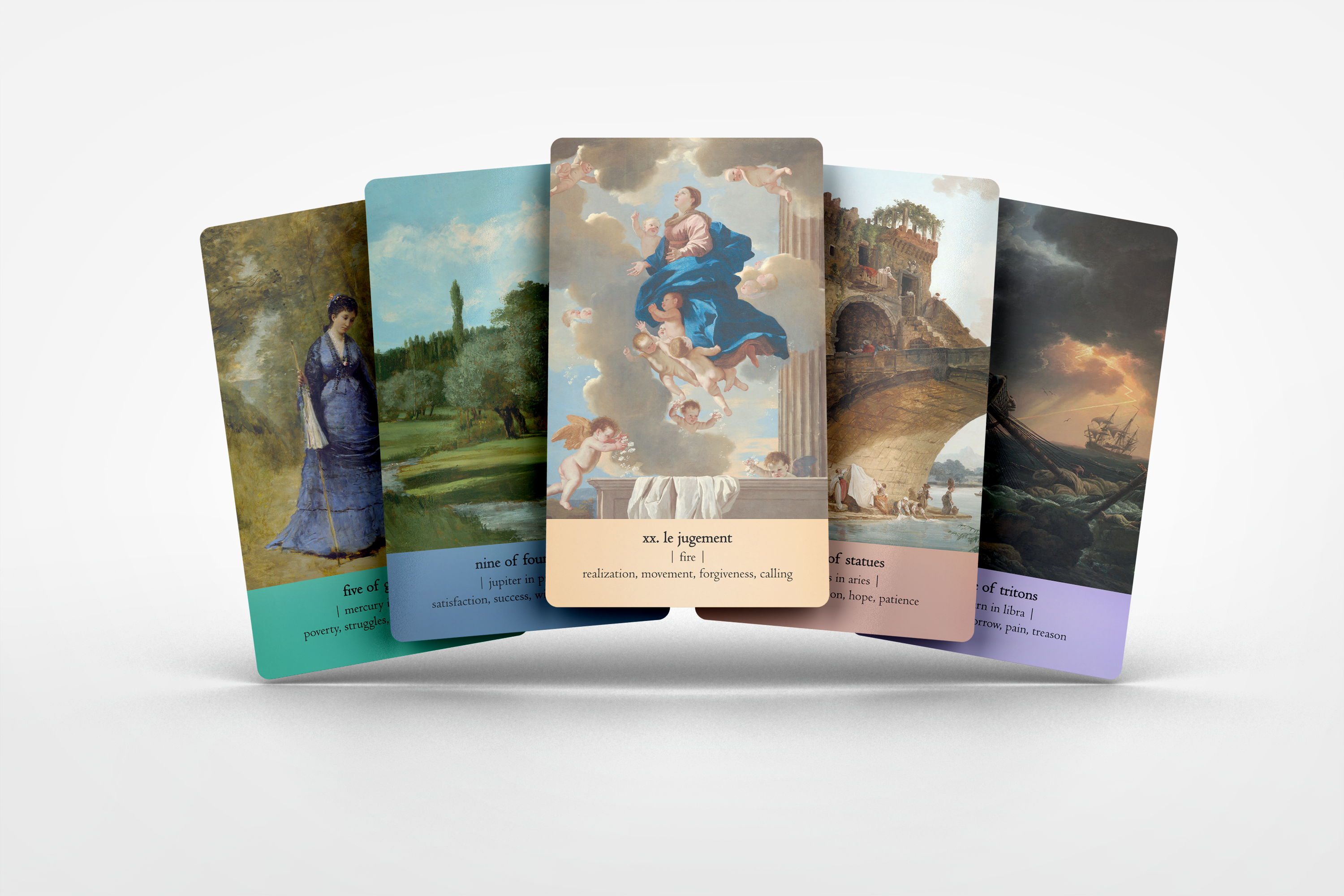 All cards contain a unique oil painting chosen specifically by me for that particular card; this deck was created out of order as I slowly found paintings that fit certain cards in my mind.