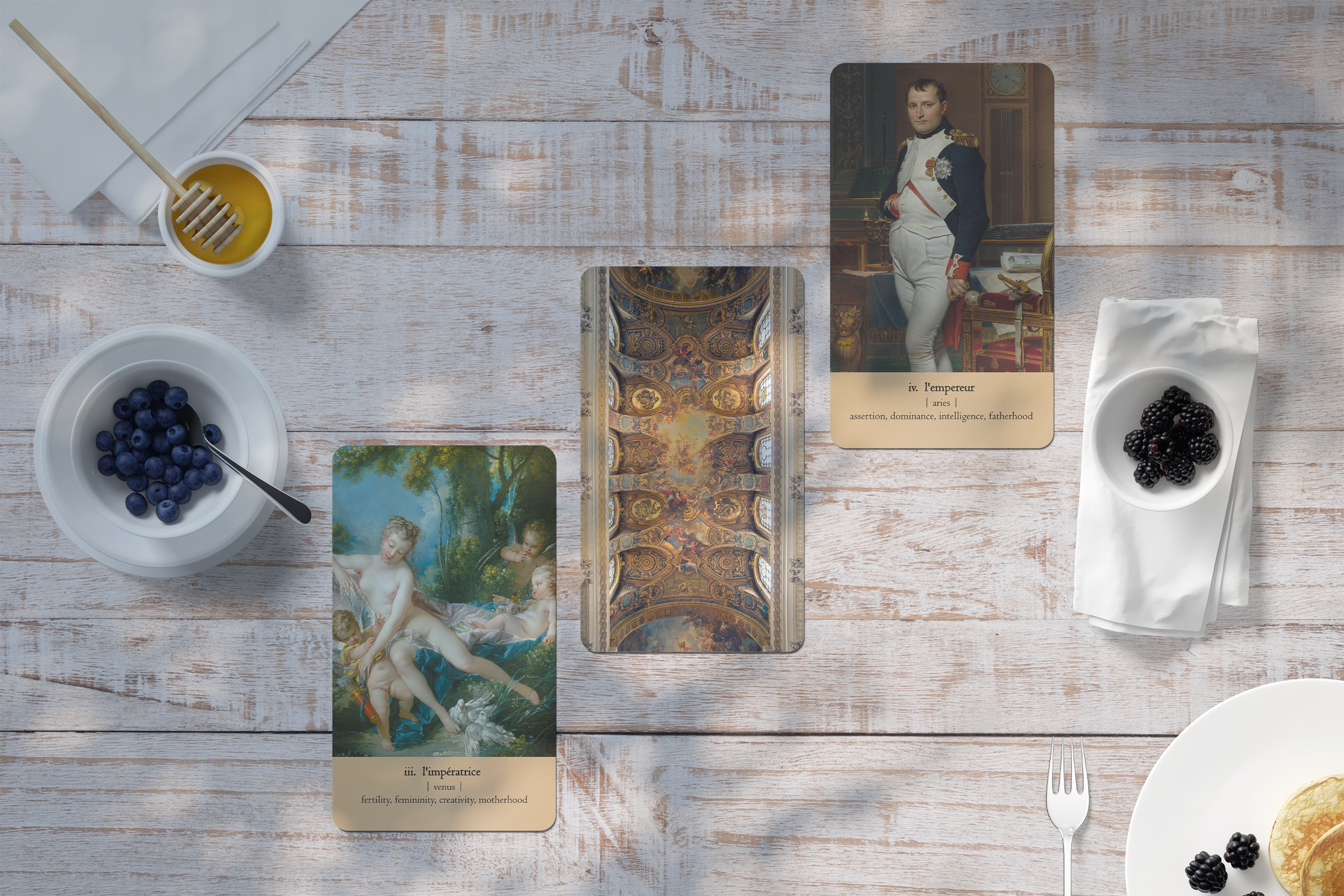 ➡️ Major Arcana are numbered and names are written in French to give that Francophile touch, and Court names have been altered as well: Page is Artisan, Knight is Chevalier, Queen is Madame, King is Monsieur