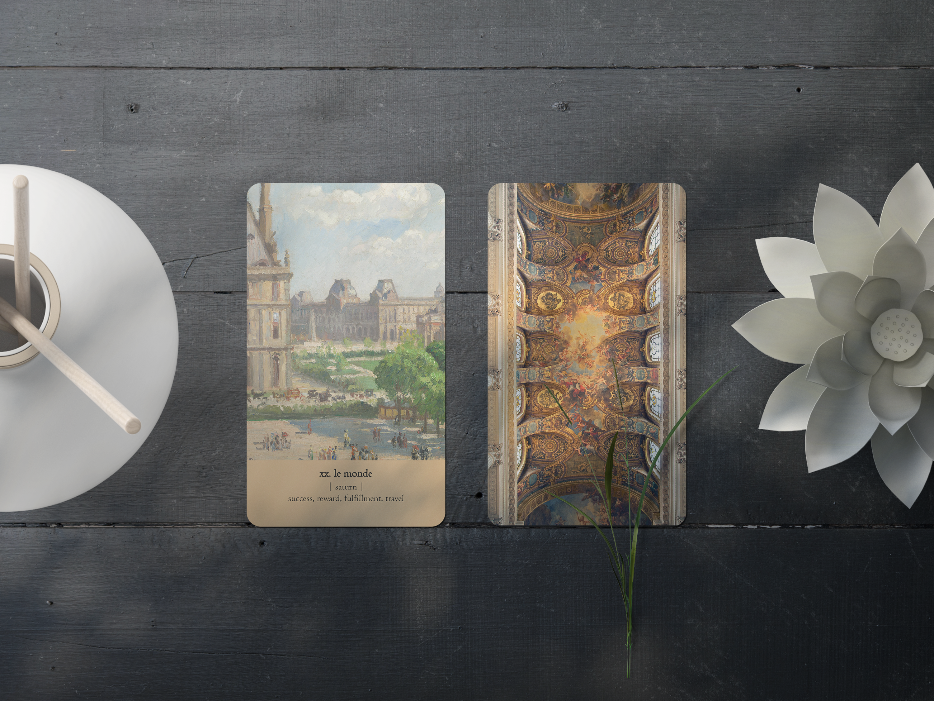 ➡️ The backs of the cards is the ceiling of the Chapel of Versailles – a combination of luxury and holiness graces this deck