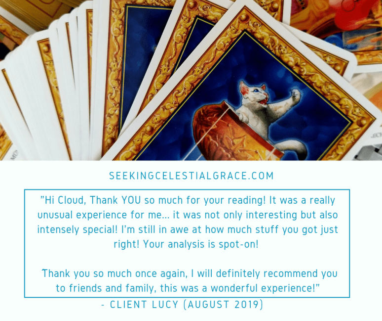 “Thank you so much dear Cloud. That was helpful giving me some insight through a complicated situation. Thank you for your detailed, personalized reading that reflects your sensitive and loving soul.” – Anissa (August 2019)