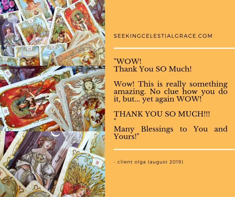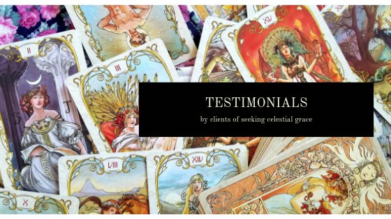 “My reading from Claudia was was insightful, interesting and fun! In addition to a great reading, she was a pleasure to deal with – very friendly, professional and timely. If anyone is looking for a tarot reading, I would definitely recommend Claudia and seekingcelestialgrace.wordpress.com. Thanks again!” – Jessica