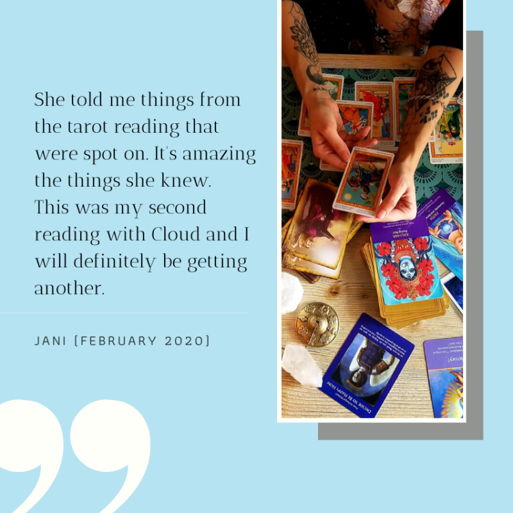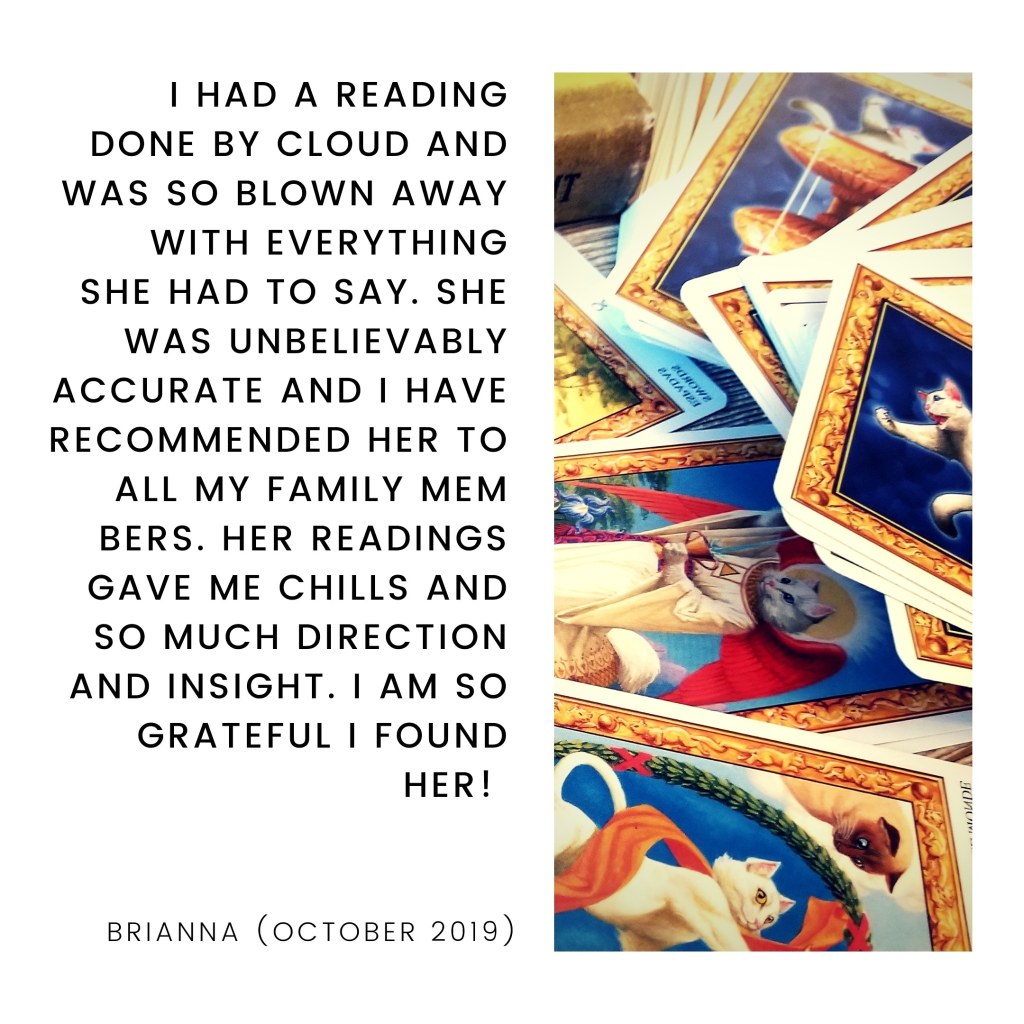 “Everything about this reading totally spoke to me. It gave me the sense of being understood in my own character before trying to give me light on my relationship. I got the confirmation and comfort I was seeking in my current love situation. Cloud also brought up a person I hadn’t asked about but was spot on in their intentions and to be wary of them. Again came comfort and confirmation.” – Mariel