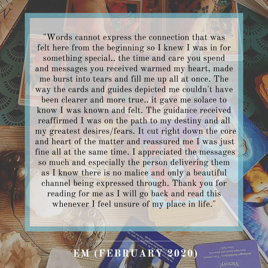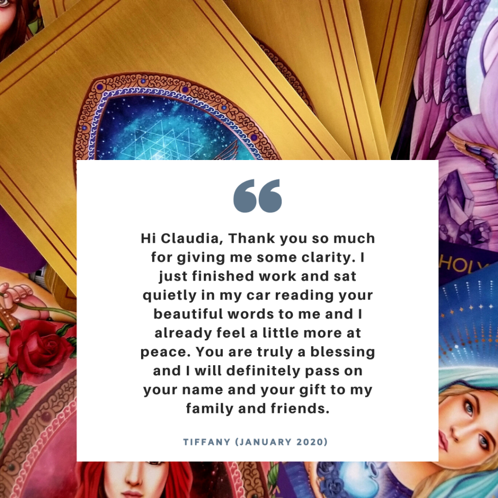 “Wow!!! Thank you so much! Not only did you email me back with my reading in less than an hour, but it was so detailed, insightful and bang on given my situation. I literally got goosebumps reading it — it’s scarily accurate as far as where my thoughts, concerns and worries lay, right now, but also for my future. You mentioned a lot of the things that are troubling me, which reassures me that not only is my gut trying to tell me something, but so is the universe, and I need to listen more to both. I was particularly interested by the section “what else do you want the cards to know” as it tied the rest of the reading together perfectly — reassuring me that you know exactly what you’re talking about and have connected everything together so well for me. Thank you so much Claudia, I am so fortunate to know someone so kind and talented as you, and wish you nothing but the best with all of this. I will definitely be tuning into your blog regularly as you’ve definitely got a gift!” – Natalee