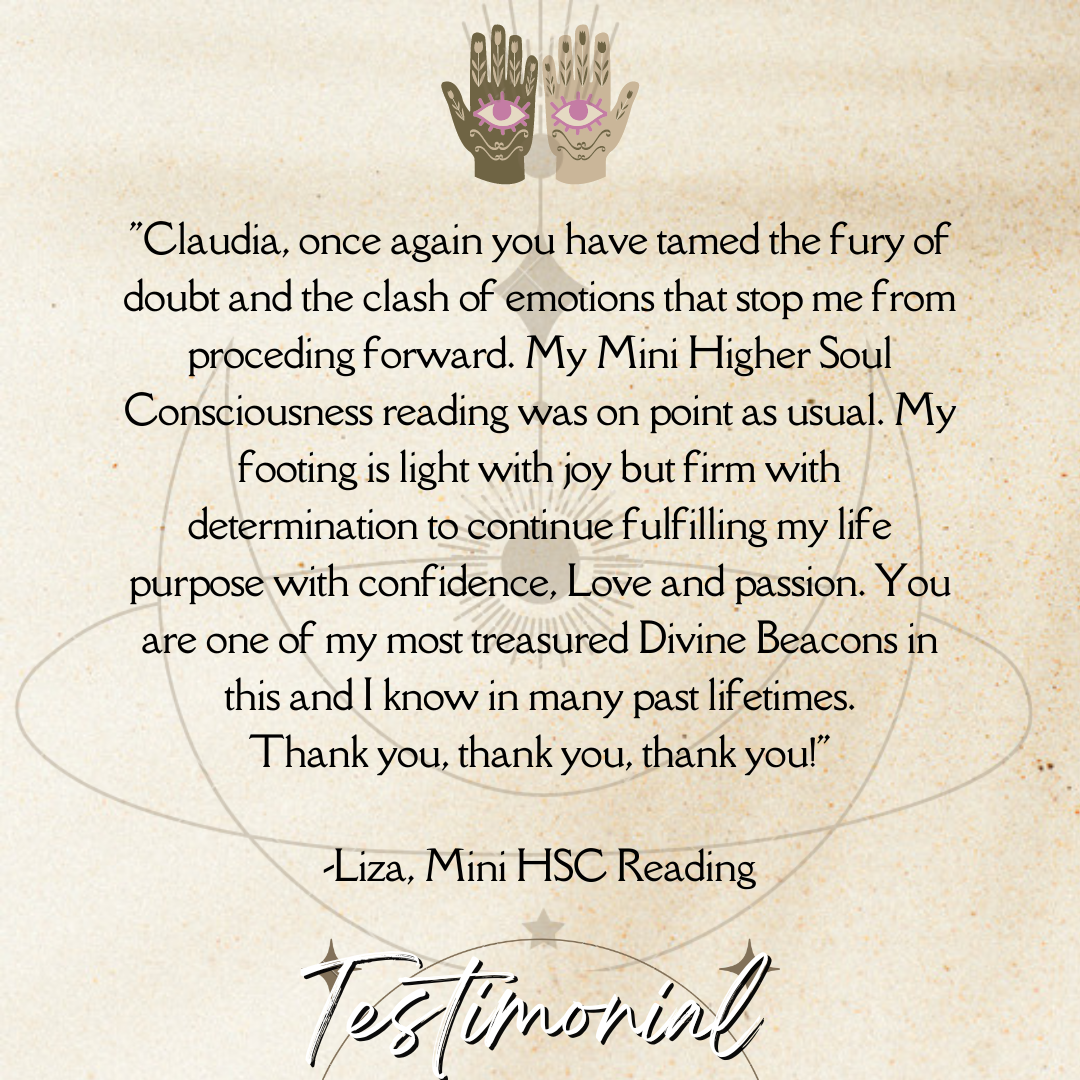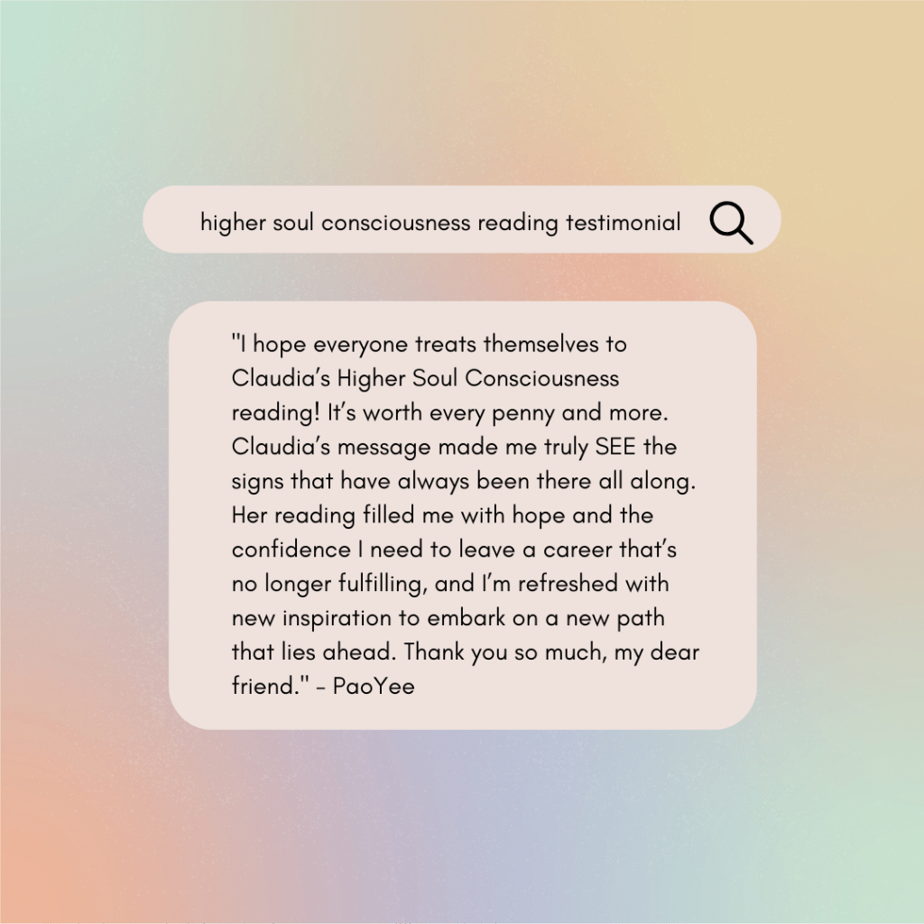 “I hope everyone treats themselves to Claudia’s Higher Soul Consciousness reading! It’s worth every penny and more. Claudia’s message made me truly SEE the signs that have always been there all along. Her reading filled me with hope and the confidence I need to leave a career that’s no longer fulfilling, and I’m refreshed with new inspiration to embark on a new path that lies ahead. Thank you so much, my dear friend.” – PaoYee