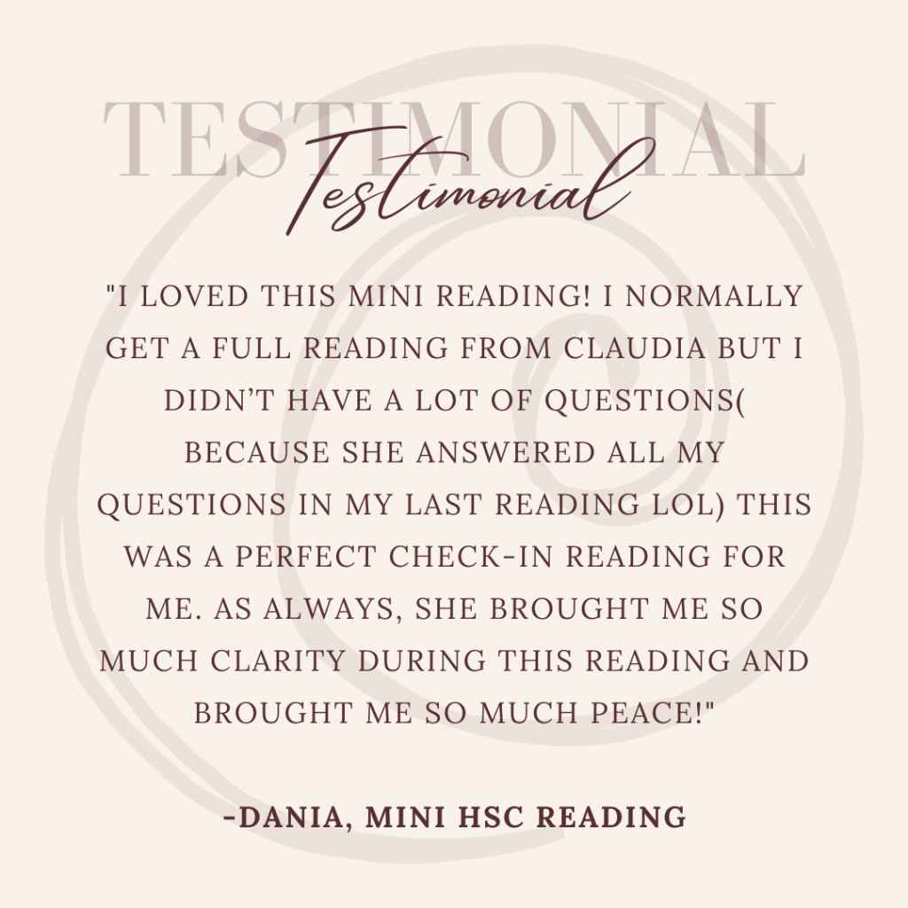 “I’m planning on taking a big overseas trip later in the year for self-discovery, and this mini reading was perfect to gain insights on some of the things I should look out for, and practice, while I’m there. It feels good knowing the steps I can take to delve deeper within myself spiritually. Thank you Claudia!!”