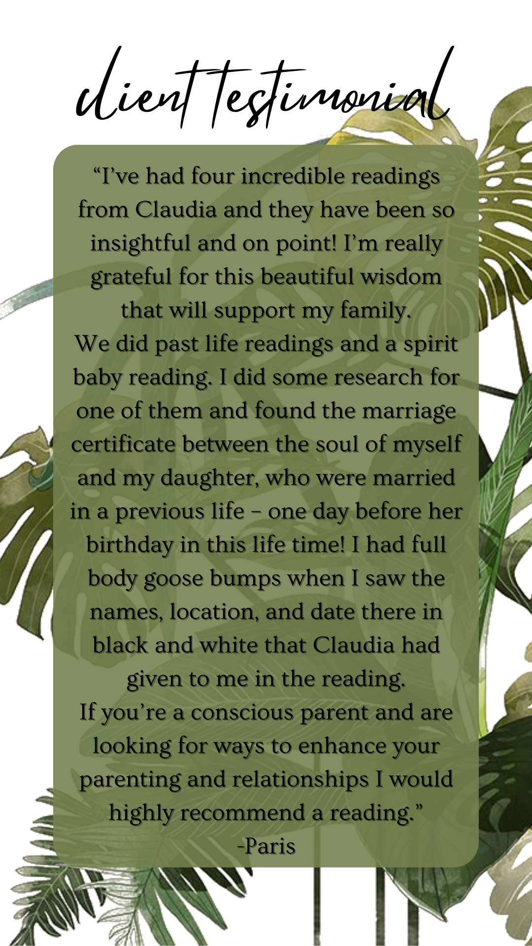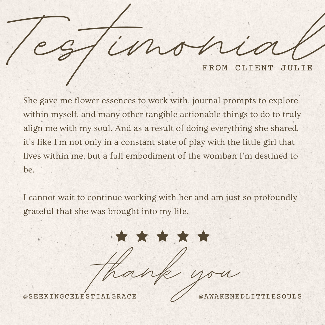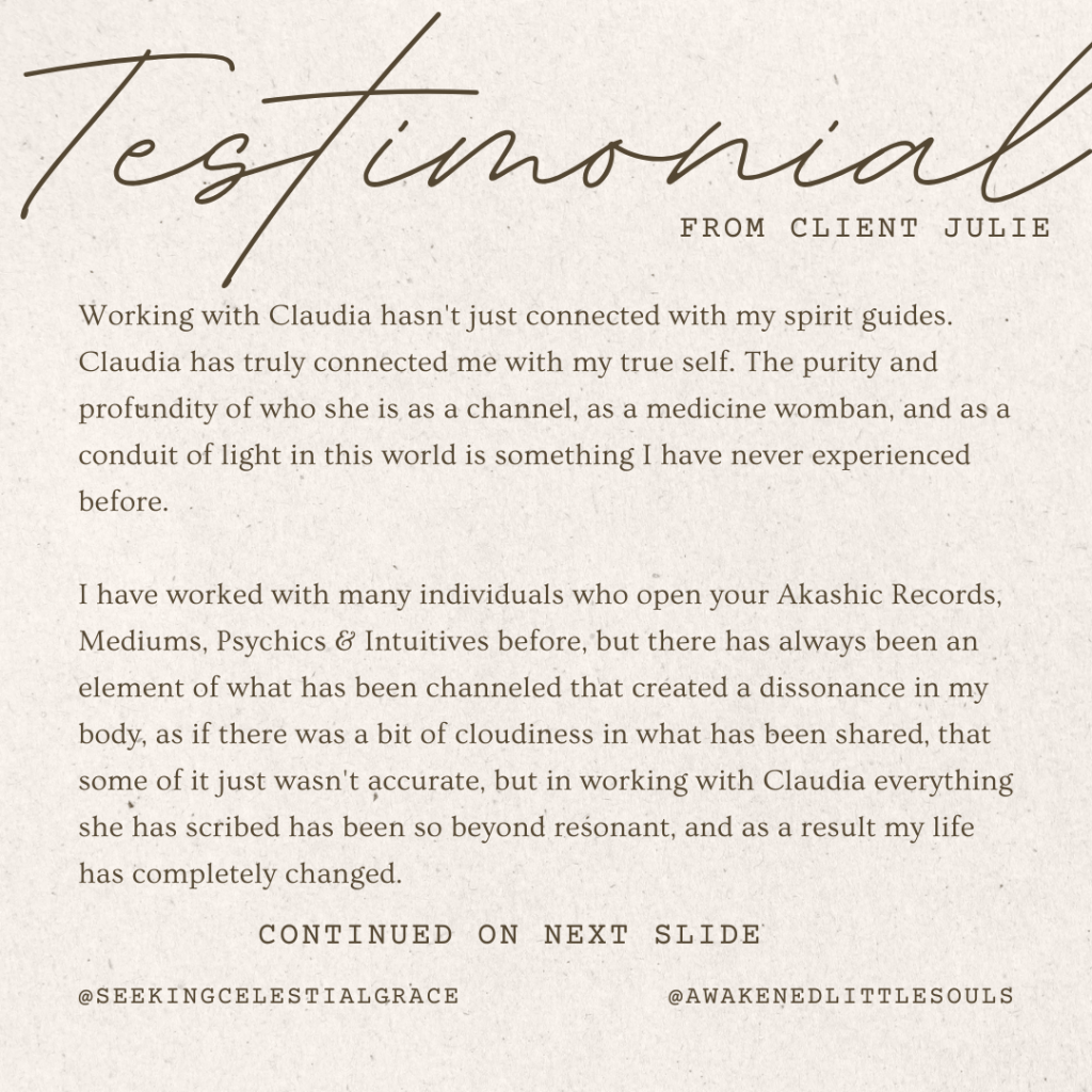 Because I have so many outstanding clients who give me out-of-this-world testimonials and recommendations to their friends and social media connections, I decided to compile them onto one page for easy access for potential clients who want to have a taste of what others have to say about my spiritual work. More recent testimonials can be seen on my Instagram under the ‘Testimonials’ story highlight.